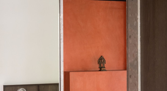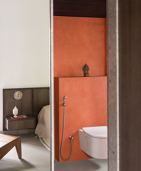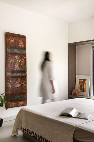 Wooden sliding and folding partitions, along with wall niches, allow for adaptable spaces that cater to the occupants' needs. The design also incorporates traditional architectural elements, such as wooden rafters on the ceiling and terracotta wall art, to enhance the rustic aesthetic.
