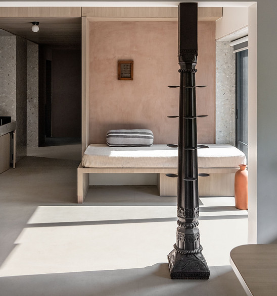 The project utilizes a natural material palette, including teak wood, lime plaster, and brass, to create a warm and inviting atmosphere.